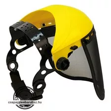 Egész arcot védő, fejpántos dróthálos pajzs, EN 1731. Láncfűrészes vágás vagy egy fejszés aprítás alkalmával, védi a fejet repülő forgácsoktól vagy bozótvágó használatakor repülő apró kövektől, jól szellőző.