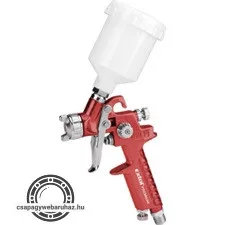 HVLP -High Volume Low Preasure. Ez a felsőtartályos levegős festékszóró magas teljesítményt alacsony nyomáson teljesít. Ezért akár 30%-os festékmegtakarítás is lehetséges. 100ml-es müanyag tartállyal rendelkezik a festékszóró. Vízbázisú és higítós festékekhez. Ennél festékszórónál kisebb a magasnyomású típusokra jellemző fröccsenés. Az alacsony nyomáson kedvezőbb a festéktapadás. Rozsdamentes fuvóka és tű a vizes bázisú festékek miatt.