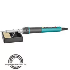 A professzionális mikroprocesszoros vezérlésű forrasztópákát LCD kijelzővel olyan lágyforrasztási alkalmazásokhoz tervezték, amelyek precizitást és a hegy hőmérsékletének szabályozását igénylik, különösen az elektronikai és ékszeripari termékeknél. Megfelelő forrasztóhegy használatával a forrasztópáka műanyag finom vágására vagy illesztésére, valamint szimbólumok fába égetésére is használható. A forrasztópáka szabványos 900M hegyeket használ. A forrasztópáka hegyét egy belső fűtőelemmel ellátott kerámia test melegíti. Egy mikroprocesszorral összekapcsolt hőmérséklet-érzékelő biztosítja a visszacsatolást, és a forrasztópáka nagyon gyorsan reagál a hegy hőmérsékletének változására. Az alkalmazott LCD kijelző minden szögben és minden fényviszonyok között tökéletesen látható. A célhőmérsékletet, a pillanatnyi csúcshőmérsékletet és a fűtésjelzőt is megjeleníti. A hőmérséklet mértékegységei °C és °F között választhatók. A gombok segítségével a hőmérsékletet 80-500°C között állíthatja be. A forrasztópáka több funkcióval is rendelkezik: indítási hőmérséklet beállítása, kalibrálás és reteszelés. Az indítási hőmérséklet beállítása funkcióval beállíthatja a forrasztópáka bekapcsolásakor megjelenő hőmérsékletet. A hőmérséklet kalibrálásával a ±50°C tartományban kompenzálhatja a nagyobb hegyek használatakor fellépő hőmérsékletveszteségeket. A zárolás egy jelszót állít be, amelyet be kell írni a forrasztási beállítások módosításához. A forrasztópáka ESD védelemmel is rendelkezik a statikus elektromosság kisülése ellen. A fém és a műanyag részek közötti műanyag átmenet speciális, nagy hőállóságú műanyagból készült, a fogantyú pedig szilikonbevonatú a kényelmes fogás érdekében munka közben. A tartozék egy kis állvány szivaccsal a forraszanyag elhelyezéséhez.