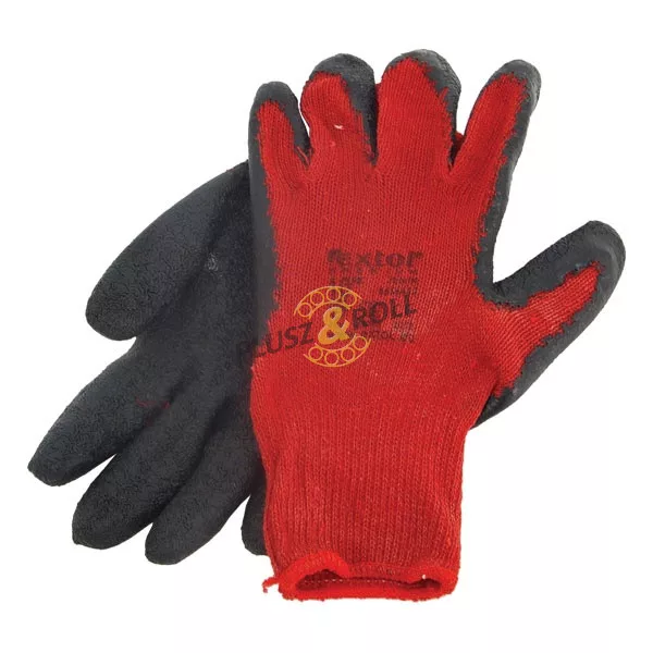 kötött kesztyű, pamut, vörös, méret: 10', latexbe mártott, csúszásgátló tenyér