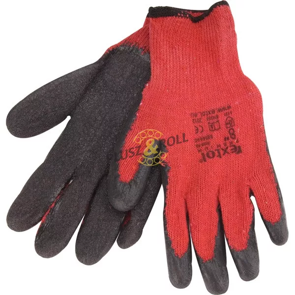 Pamut/poliészter keverékbõl készült, természetes latexbe félig mártott, kötött, varratmentes kesztyû csúszásgátló kikészítésû tenyérrel és ujjakkal, valamint rugalmas kötött mandzsettával.