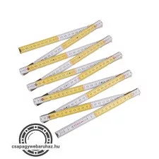 Minőségi bükkfa, tömör sárgaréz kötésekkel és többrétegű, kopásnak, hámlásnak, időjárási hatásoknak és UV-sugárzásnak ellenálló felületkezeléssel, fehér / sárga szín, cm / mm beosztás, pontossági osztály: III.