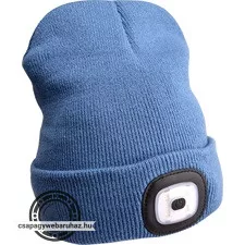 sapka, kék, kötött, kivehető LED homloklámpával, 4×45 Lumen; USB tölthető Li-ion akku, 3 funkció (100%-75%-50% fényerő)