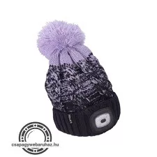 sapka, kék/lila pomponnal, kötött, kivehető LED homloklámpával, 4×45 Lumen; USB tölthető Li-ion, 3funkció (100%-75%-50%)