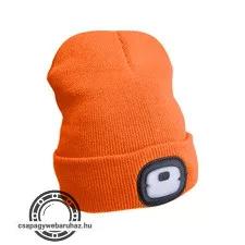 sapka, neon-narancs, kötött, kivehető LED homloklámpával, 4×25 Lumen; USB tölthető Li-ion akku, 3funkció (100%-75%-50%)