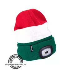 sapka, piros/fehér/zöld, kötött, kivehető LED homloklámpával, 4×45 Lumen; USB tölthető Li-ion, 3funkció (100%-75%-50%)