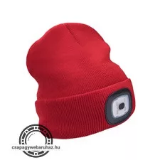 sapka, piros, kötött, kivehető LED homloklámpával, 4×45 Lumen; USB tölthető Li-ion, 3funkció (100%-75%-50% fénye.)