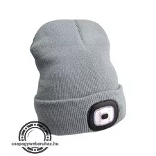 sapka, szürke, kötött, kivehető LED homloklámpával, 4×45 Lumen; USB tölthető Li-ion akku, 3funkció (100%-75%-50% fénye.)