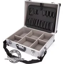 szerszámtáska (koffer) alumínium; 460×330×155 mm, ezüst színű, hordszíjjal